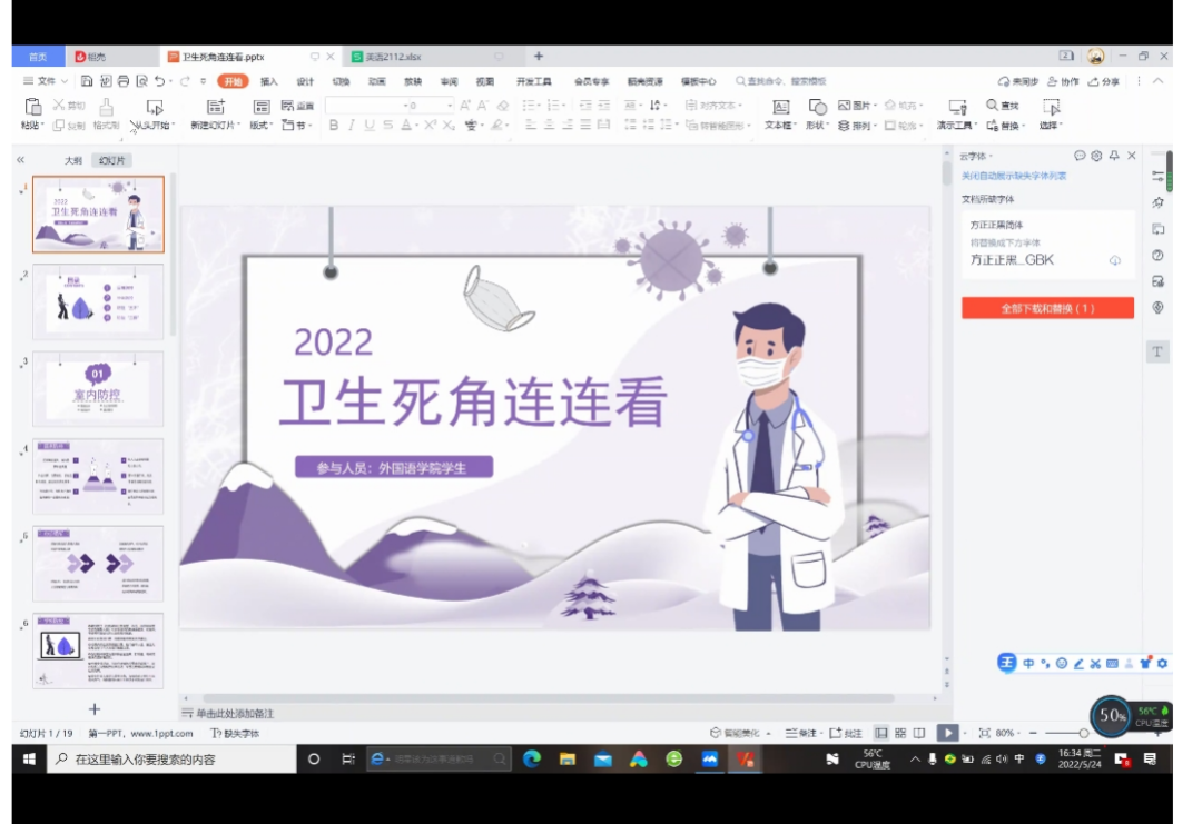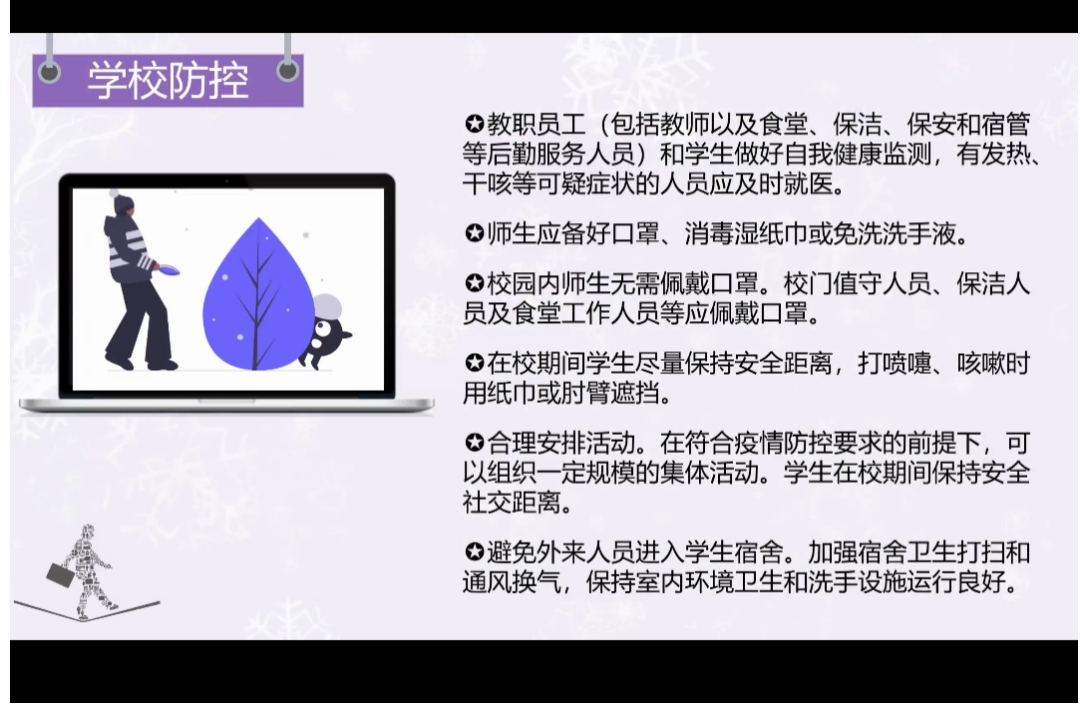 活动开始,主持人科普了关于卫生活动的相关知识,并且着重提出大学生要时刻关注环保,我们的工作和学习都与环境卫生息息相关。本次活动分为四个部分,从居家生活和学校生活谈起,日常防控防控是重中之重,外出防控知识更是让我们安心享受生活的关键,防控的三要三不要也为我们更好地做好防护提供了方向。