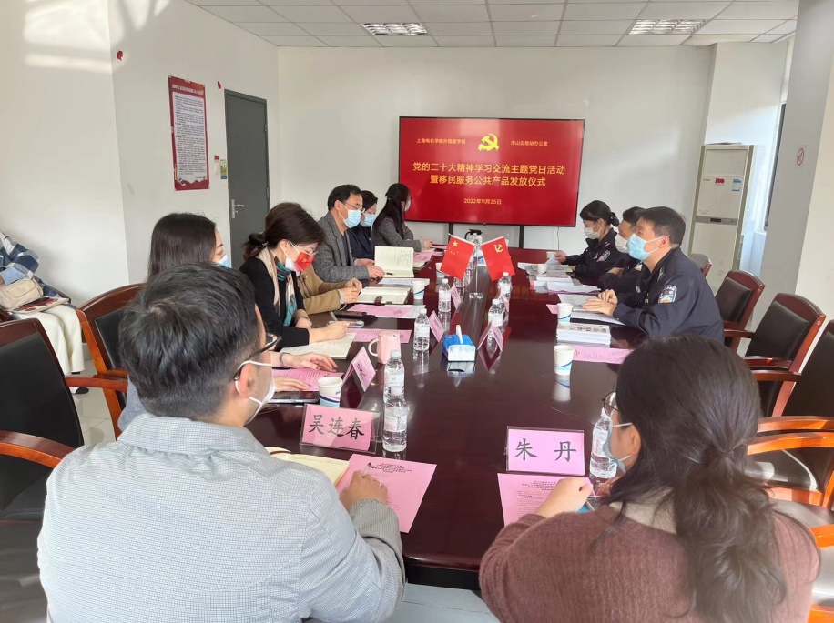 2022 年 11 月 25 日下午,外国语学院党总支与洋山边检站办公室在文理楼413联合举办党的二十大精神学习交流主题党日活动暨移民服务公共产品发放仪式。参加活动的有洋山边检站书记办公室主任陈念、洋山边检站办公室二级警长黄金秋、洋山边检站办公室二级警长陈玥和边防检查处一级警长蒲莹,外国语学院党政班子成员、党支部书记代表、专职组织员,国际教育学院辅导员吴怡和留学生代表。活动由外国语学院党总支书记项军和洋山边检站办公室主任陈念共同主持。
