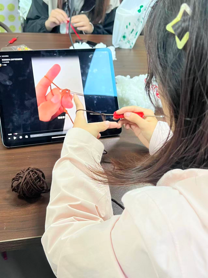 活动中,只见同学们手指翻飞,全神贯注于每一针、每一线。编织时的专注,让大家暂时忘却了学业的繁忙与生活的琐碎,将心神完全沉浸在创造的宁静之中。现场没有了往日的喧嚣,取而代之的是一种集体创造的平和与温暖。这种重复而富有节奏的手部运动,成为一种有效的正念练习,极大地缓解了焦虑情绪,培养了耐心与专注力。