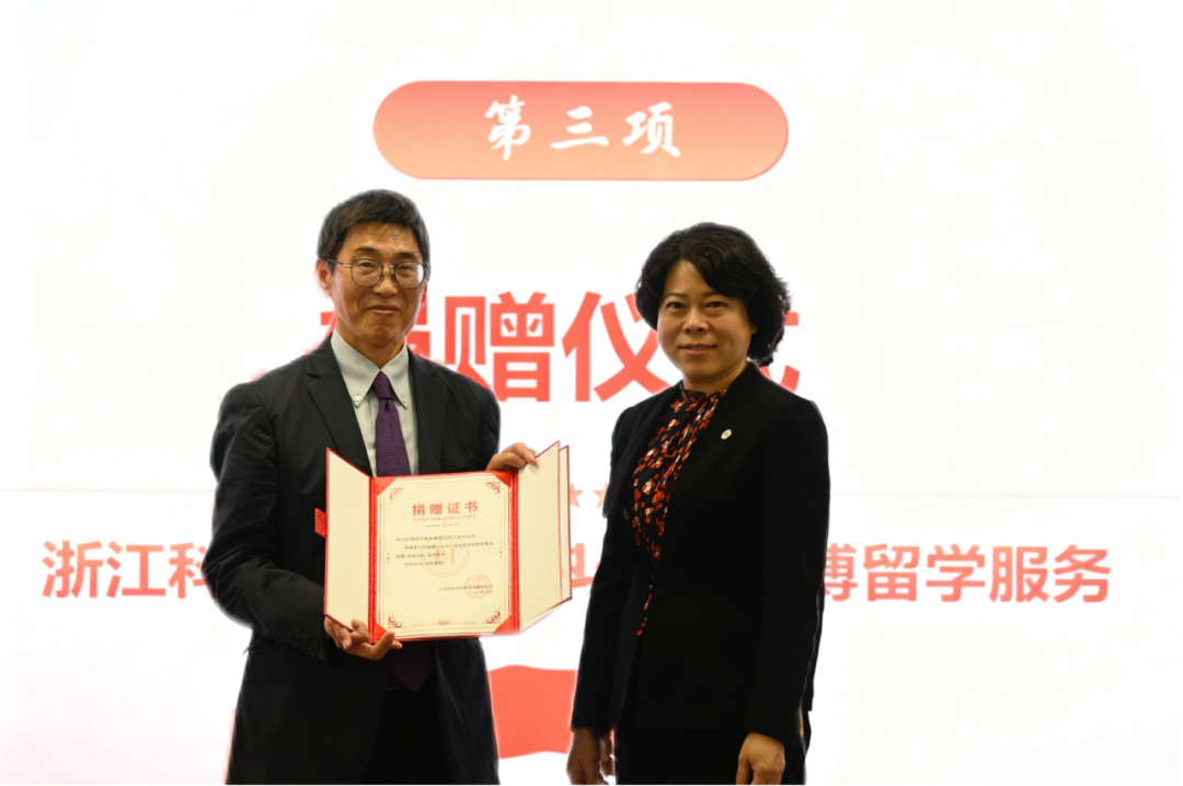 活动第三项,举行了捐赠仪式,由学校党委副书记、副院长李晓军为浙江科博留学服务有限公司上海分公司副总经理薛仁林颁发捐赠证书。此次捐赠是外国语学院坚持党建引领、加强产教融合的成果之一。薛经理表示,未来科博将进一步与加强与学院的合作,在拓宽国际化育人渠道的同时,探索航空航天领域的项目合作,携手共促人才培养,实现校企共同高质量发展。