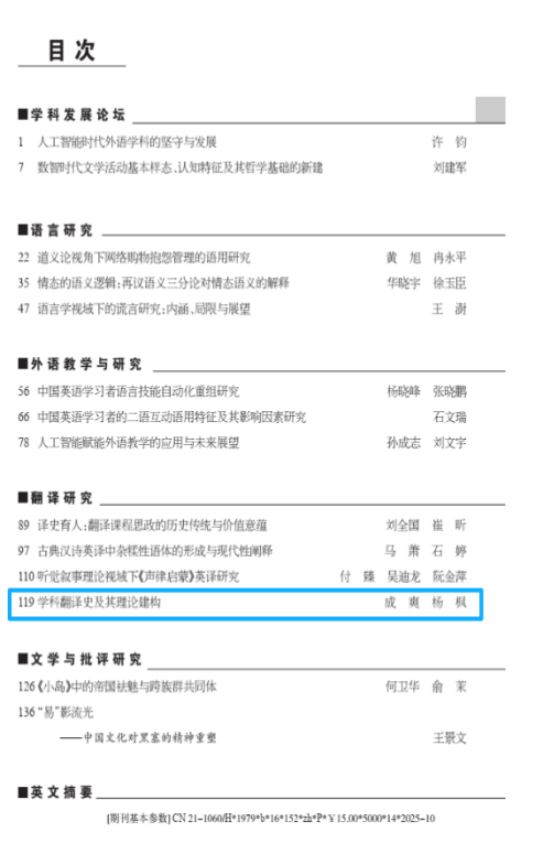 1 | 成 爽,杨 枫(外) | 学科翻译史及其理论建构 | 外语与外语教学 | CSSCI | 一作 |