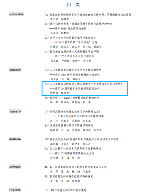 2 | 陈忆浓,魏丽娜(外) | 人工智能驱动的自适应学习对学生个性化 学习效果有何影响?——基于29项实验和准实验研究的元分析 | 现代教育技术 | CSSCI | 一作 |