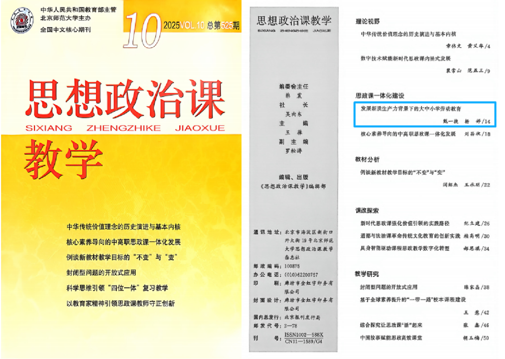 3、甄一捷老师、杨婷老师在北大核心期刊《思想政治课教学》(复合影响因子1.906,综合影响因子0.29)发表题为 “发展新质生产力背景下的大中小学劳动教育”的论文。甄一捷老师为第一作者,杨婷老师为第二作者,上海电机学院为第二单位。